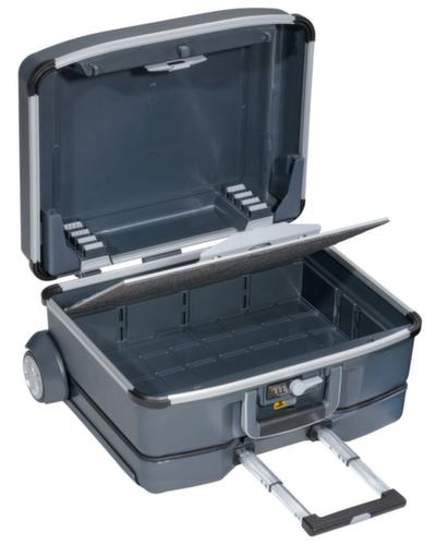 "longDescription": "<h2>Servicetrolley/Montagetrolley</h2><ul><li>Aus Polycarbonat, Rahmen aus Aluminium</li><li>Mit einer Hand zu öffnen und zu schließen</li><li>Deckel rastet beim Öffnen ein und bremst beim Schließen</li><li>Verschließbar mit Zahlenschloss</li><li>4-fach Teleskopauszug aus Aluminium</li><li>Leichtlaufende, verschleißfeste Räder, kugelgelagert</li></ul><br><br>Der Koffer<br>Dieser Servicetrolley der Serie ProServe von Allit ist aus Polycarbonat und somit äußerst robust und schlagfest. Der Profilrahmen ist aus Aluminium und schließt dicht ab. Der Koffer ist ganz einfach mit einer Hand zu öffnen und zu schließen: Zum Schließen einfach den Koffer zudrücken und zum Öffnen den Einhandhebel betätigen. Der Deckel rastet beim Öffnen ein und bleibt so in seiner Position. Zusätzlich verfügt er über eine integrierte Deckelbremse, welche einen Widerstand leistet und somit das Gewicht des Deckels beim Schließen kontrolliert. Der Koffer ist mit einem Zahlenschloss verschließbar und schützt Ihre Utensilien vor unbefugtem Zugriff.<br><br>Das Fahrwerk<br>Der Trolley hat einen 4-fachen Teleskopauszug aus Aluminium. Dieser wird mit einem Druckknopf betätigt. Die Räder mit Kugellager sind besonders leichtlaufend und äußerst verschleißfest. <br><br>Die Innenausstattung<br>Der Montagetrolley ist wahlweise als Grundmodell oder mit verschiedenen Innenausstattungen erhältlich. Das Grundmodell können Sie mit vielen Einteilungselementen individuell nach Ihren Bedürfnissen ausstatten. Sie können unter anderem zwischen Werkzeughaltern, Kleinteileboxen oder Schaumstoffeinlagen wählen.<br><br>Das Material<br>Polycarbonat hat eine hohe Festigkeit, Steifigkeit und Härte und besitzt gute Isolationseigenschaften gegen Strom. Außerdem hat das Material einen breiten Temperaturbereich und ist beständig gegenüber Wasser, vielen Ölen und Fetten, vielen Mineralsäuren und wässrigen Lösungen von neutralen Salzen und Oxidationsmitteln. Polycarbonat hat also eine sehr hohe Alterungsbeständigkeit und macht diesen Montagetrolley zu Ihrem langjährigen Begleiter.<br><br><strong>Gut zu wissen!</strong><br><br>Sie müssen eine Flugreise mit Ihrem Servicetrolley antreten? Dann bestellen Sie das Kofferband mit Zahlenschloss und TSA-Schloss gleich mit.<br>",