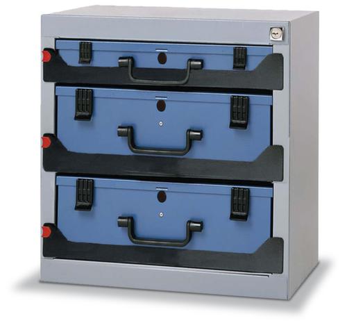 Aus Stahl, Korpus mit mit schlag- und kratzfester Pulverbeschichtung in RAL7000 fehgrau. Durch die kugelgelagerten Teleskopschienen öffnen und schließen sie, auch bei hoher Belastung, besonders leicht. Dabei gewährt der Vollauszug zu 100% einfachen Zugriff bis in die letzte Ecke. Die Einzelauszugsperre verhindert, dass mehrere Schubladen gleichzeitig geöffnet werden und damit ein Umkippen. Verschließbar über Sicherheitsschloss. 3 Koffer. Koffer aus Stahl. Koffer mit schlag- und kratzfester Pulverbeschichtung in RAL5007 Brillantblau. Kästen in farbig.