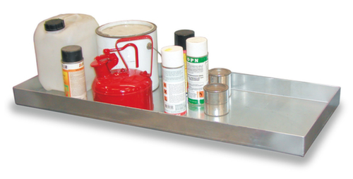 "longDescription": "<h2>Auffangwanne</h2><strong>sichere Lagerung von Kleingebinden</strong><br><ul><li>Geeignet für wassergefährdende und brennbare Stoffe</li><li><strong>Kein Überschwappen</strong> durch hohe umlaufende Seitenränder</li></ul><br><strong>Sie haben die Wahl:</strong><br><ul><li><strong>Korrosionsgeschützt oder rostfrei</strong> - aus verzinktem Stahl oder Edelstahl</li></ul><br><strong>Bestimmungen!</strong><br><br>Bauweise der Wannen behördlich zugelassen und geprüft. Einsatz für gewässergefährdende und entzündbare Stoffe zur Lagerung unter Dach.<br>",