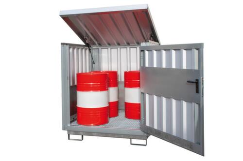 Konstruktion aus profiliertem Stahlblech. Das Depot ist mit einer Stahl-Bodenwanne mit verzinktem Gitterrost ausgestattet. Dort können Gefahrstoffgebinde sicher lagern, so dass Verunreinigungen Ihrer Lagerfläche bzw. des Erdreichs bei Leckagen zuverlässig verhindert werden. Gitterrost aus Stahl mit korrosionsschützender Zinkbeschichtung. Der Lagerplatz ist abschließbar und so vor unbefugtem Zugriff geschützt. Das aufklappbare Dach ermöglicht den zusätzlichen Zugriff von oben auf die gelagerten Gefahrstoffe. Durch die zwei Gasdruckfedern lässt es sich leichte Öffnen und Schließen. Mobil einsetzbar. Zum einfachen Transportieren mit Einfahrtaschen ausgestattet.