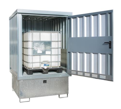 Konstruktion aus profiliertem Stahlblech. Das Depot ist mit einer Stahl-Bodenwanne mit verzinktem Gitterrost ausgestattet. Dort können Gefahrstoffgebinde sicher lagern, so dass Verunreinigungen Ihrer Lagerfläche bzw. des Erdreichs bei Leckagen zuverlässig verhindert werden. Gitterrost aus Stahl mit korrosionsschützender Zinkbeschichtung. Über die Lüftungsschlitze kann eine kontinuierliche Luftzirkulation stattfinden. Der Lagerplatz ist abschließbar und so vor unbefugtem Zugriff geschützt. Das Dach ist geschlossen.