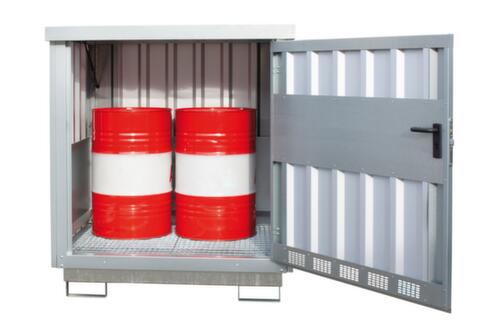 "description": "f. wasserg./brennbare Stoffe, HxBxT 1730x1535x1290mm, f. 2x200l Fass, m. Bodenwanne m. Gitterrost, Einfahrtaschen",