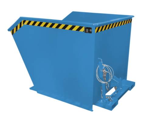 Die wichtigsten Maße des Bauer Kippbehälters auf einen BlickDer Kippvorgang wird bequem vom Fahrersitz aus per Zugseilentriegelung ausgelöst. Die besondere Anordnung des Drehpunktes sorgt für einen günstigen Kippwinkel und damit für eine schnelle und restlose Entleerung. Das Rückführen in die Grundposition wird durch das Absenken auf den Boden erreicht und die Kippsicherung rastet wieder automatisch ein. Mit einer Sicherungskette an den Einfahrtaschen kann der Kippbehälter zusätzlich am Stapler gegen Abrutschen gesichert werden . Hohe Stabilität durch umlaufende gekantete Randverstärkung und stabilen Grundrahmen. Robuste Konstruktion aus Stahl mit Lackierung in RAL5012 Lichtblau. Zum einfachen Transportieren und Entleeren nehmen Sie den Kippbehälter einfach mit dem Stapler über die Einfahrtaschen auf und bringen ihn auf die gewünschte Position und erforderliche Höhe.