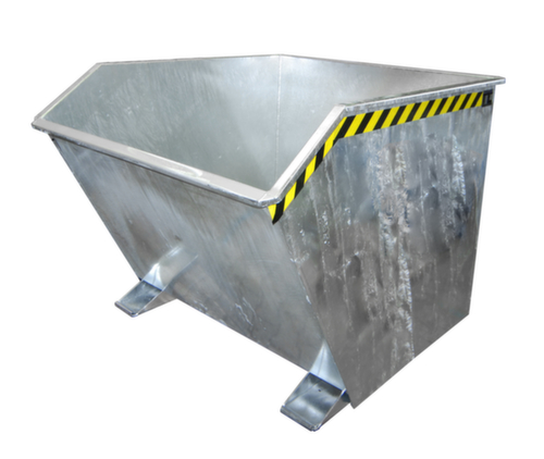Der Kippvorgang wird bequem vom Fahrersitz aus per Zugseilentriegelung ausgelöst. Die besondere Anordnung des Drehpunktes sorgt für einen günstigen Kippwinkel und damit für eine schnelle und restlose Entleerung. Das Rückführen in die Grundposition wird durch das Absenken auf den Boden erreicht und die Kippsicherung rastet wieder automatisch ein. Mit einer Sicherungskette an den Einfahrtaschen kann der Kippbehälter zusätzlich am Stapler gegen Abrutschen gesichert werden . Hohe Stabilität durch umlaufende gekantete Randverstärkung und stabilen Grundrahmen. Robuste Konstruktion aus Stahl mit korrosionsschützender Zinkbeschichtung. Zum einfachen Transportieren und Entleeren nehmen Sie den Kippbehälter einfach mit dem Stapler über die Einfahrtaschen auf und bringen ihn auf die gewünschte Position und erforderliche Höhe.