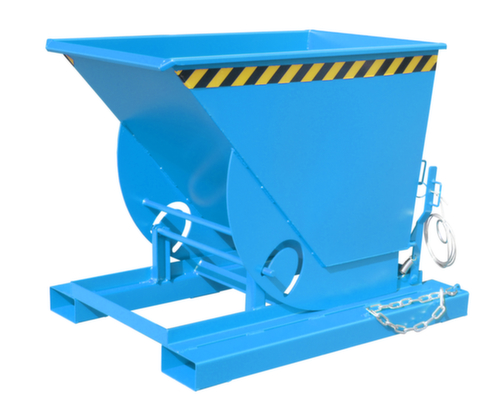 Der Kippvorgang wird bequem vom Fahrersitz aus per Zugseilentriegelung ausgelöst. Die Abrollkufen gewährleisten durch Ausnutzung des günstigen Lastenschwerpunktes eine sanftes Abkippen. Nach der Entleerung schwenkt der Kippbehälter automatisch wieder in die Ausgangsposition zurück und die Kippsicherung rastet wieder automatisch ein. Mit einer Sicherungskette an den Einfahrtaschen kann der Kippbehälter zusätzlich am Stapler gegen Abrutschen gesichert werden . Hohe Stabilität durch umlaufende gekantete Randverstärkung. Robuste Konstruktion aus Stahl mit Lackierung in RAL5012 Lichtblau. Zum einfachen Transportieren und Entleeren nehmen Sie den Kippbehälter einfach mit dem Stapler über die Einfahrtaschen auf und bringen ihn auf die gewünschte Position und erforderliche Höhe.