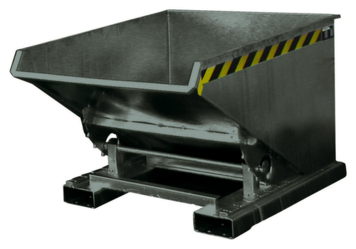Der Kippvorgang wird bequem vom Fahrersitz aus per Zugseilentriegelung ausgelöst. Die Abrollkufen gewährleisten durch Ausnutzung des günstigen Lastenschwerpunktes eine sanftes Abkippen. Nach der Entleerung schwenkt der Kippbehälter automatisch wieder in die Ausgangsposition zurück und die Kippsicherung rastet wieder automatisch ein. Mit einer Sicherungskette an den Einfahrtaschen kann der Kippbehälter zusätzlich am Stapler gegen Abrutschen gesichert werden . Hohe Stabilität durch umlaufende gekantete Randverstärkung und stabilen Grundrahmen. Robuste Konstruktion aus Stahl mit Lackierung in RAL7005 Mausgrau. Zum einfachen Transportieren und Entleeren nehmen Sie den Kippbehälter einfach mit dem Stapler über die Einfahrtaschen auf und bringen ihn auf die gewünschte Position und erforderliche Höhe.