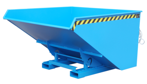 Der Kippvorgang wird bequem vom Fahrersitz aus per Zugseilentriegelung ausgelöst. Die Abrollkufen gewährleisten durch Ausnutzung des günstigen Lastenschwerpunktes eine sanftes Abkippen. Nach der Entleerung schwenkt der Kippbehälter automatisch wieder in die Ausgangsposition zurück und die Kippsicherung rastet wieder automatisch ein. Mit einer Sicherungskette an den Einfahrtaschen kann der Kippbehälter zusätzlich am Stapler gegen Abrutschen gesichert werden . Hohe Stabilität durch umlaufende gekantete Randverstärkung und stabilen Grundrahmen. Robuste Konstruktion aus Stahl mit Lackierung in RAL5012 Lichtblau. Zum einfachen Transportieren und Entleeren nehmen Sie den Kippbehälter einfach mit dem Stapler über die Einfahrtaschen auf und bringen ihn auf die gewünschte Position und erforderliche Höhe.