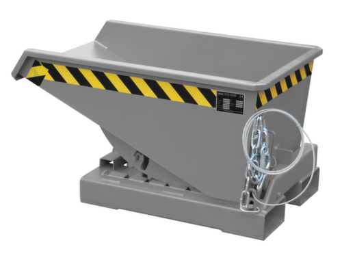 Die wichtigsten Maße des Bauer Kippbehälters auf einen BlickDer Kippvorgang wird bequem vom Fahrersitz aus per Zugseilentriegelung ausgelöst. Die Abrollkufen gewährleisten durch Ausnutzung des günstigen Lastenschwerpunktes eine sanftes Abkippen. Nach der Entleerung schwenkt der Kippbehälter automatisch wieder in die Ausgangsposition zurück und die Kippsicherung rastet wieder automatisch ein. Mit einer Sicherungskette an den Einfahrtaschen kann der Kippbehälter zusätzlich am Stapler gegen Abrutschen gesichert werden . Hohe Stabilität durch umlaufende gekantete Randverstärkung und stabilen Grundrahmen. Robuste Konstruktion aus Stahl mit Lackierung in RAL7005 Mausgrau. Zum einfachen Transportieren und Entleeren nehmen Sie den Kippbehälter einfach mit dem Stapler über die Einfahrtaschen auf und bringen ihn auf die gewünschte Position und erforderliche Höhe.