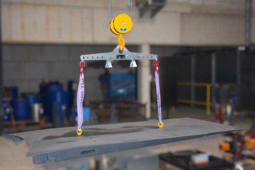 Über die Kranöse wird die Lasttraverse ganz einfach direkt im Kran eingehangen. Das ist besonders bei niedrigen Deckenhöhen praktisch, wo Kettenaufhängungen zu lang wären. Die zwei Wirbellasthaken lassen sich in den zahlreichen Bohrungen individuell auf das Lastgut passend verstellen. Die Anschlagpunkte am Lastgut werden dadurch auf Distanz gehalten und es entstehen nur senkrechte Zugkräfte. Zudem ist dadurch ein besonders beruhigter und pendelfreier Transport möglich. Durch die untergebauten Abstellfüße kann die Traverse sicher aufgestellt werden und das Risiko von Unfällen und Verletzungen wird minimiert. Sie steht wackelfrei und stabil, auch auf unebenerem Gelände und der Boden wird vor Beschädigungen geschützt.
