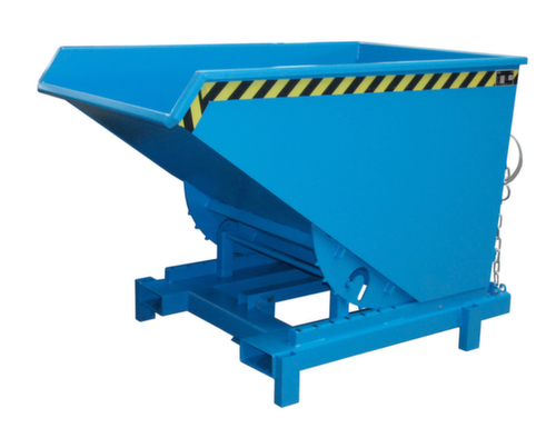 Beim Aufsetzen des Kippbehälters auf dem Containerrand löst der Auslösefuß die Entriegelung und setzt eine automatische Entleerung in Gang. So wird Ihr Arbeitsprozess bequem beschleunigt und erhöht die Sicherheit in Ihrem Betrieb. Alternativ lässt sich der Behälter jederzeit manuell über eine Zugseilentriegelung entleeren. Die Abrollkufen gewährleisten durch Ausnutzung des günstigen Lastenschwerpunktes eine sanftes Abkippen. Nach der Entleerung schwenkt der Kippbehälter automatisch wieder in die Ausgangsposition zurück und die Kippsicherung rastet wieder automatisch ein. Robuste Konstruktion aus Stahl mit Lackierung in RAL5012 Lichtblau. Zum einfachen Transportieren und Entleeren nehmen Sie den Kippbehälter einfach mit dem Stapler über die Einfahrtaschen auf und bringen ihn auf die gewünschte Position und erforderliche Höhe.
