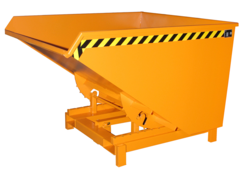 Beim Aufsetzen des Kippbehälters auf dem Containerrand löst der Auslösefuß die Entriegelung und setzt eine automatische Entleerung in Gang. So wird Ihr Arbeitsprozess bequem beschleunigt und erhöht die Sicherheit in Ihrem Betrieb. Alternativ lässt sich der Behälter jederzeit manuell über eine Zugseilentriegelung entleeren. Die Abrollkufen gewährleisten durch Ausnutzung des günstigen Lastenschwerpunktes eine sanftes Abkippen. Nach der Entleerung schwenkt der Kippbehälter automatisch wieder in die Ausgangsposition zurück und die Kippsicherung rastet wieder automatisch ein. Robuste Konstruktion aus Stahl mit Lackierung in RAL2000 Gelborange. Zum einfachen Transportieren und Entleeren nehmen Sie den Kippbehälter einfach mit dem Stapler über die Einfahrtaschen auf und bringen ihn auf die gewünschte Position und erforderliche Höhe.
