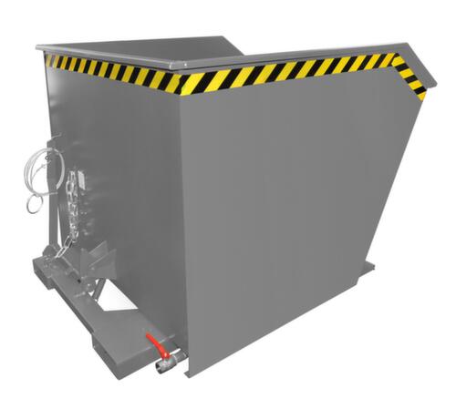 Der Kippvorgang wird bequem vom Fahrersitz aus per Zugseilentriegelung ausgelöst. Die besondere Anordnung des Drehpunktes sorgt für einen günstigen Kippwinkel und damit für eine schnelle und restlose Entleerung. Durch die Kippsicherung wird sichergestellt, dass der Behälter während des Transportes nicht unbeabsichtigt auskippt. Der Kippbehälter ist auch für die Aufnahme von Flüssigkeiten geeignet - öl- und wasserdicht verschweißt. Aufgefangene Flüssigkeiten, wie Öl oder Wasser, werden durch ein Sieb von den Feststoffen getrennt und können zeitsparend über ein Ablasshahn abgelassen werden, ohne den Container kippen zu müssen. Wände geschlossen. Hohe Stabilität durch umlaufende gekantete Randverstärkung und stabilen Grundrahmen. Mobil einsetzbar. Zum einfachen Transportieren mit Einfahrtaschen ausgestattet.