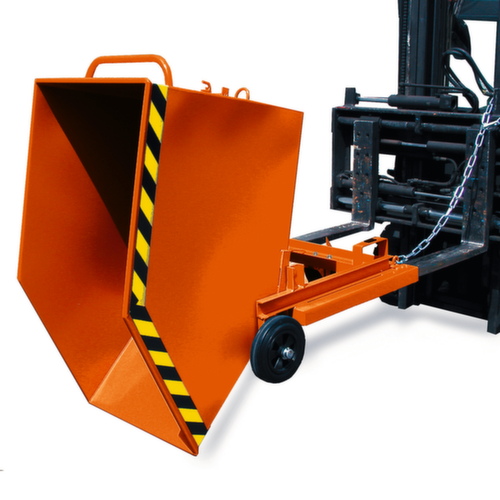 Die wichtigsten Maße des Bauer Kippbehälters auf einen BlickDer Kippvorgang wird bequem über eine Handgriff an der Rückseite manuell ausgelöst. Zum Schutz vor unbeabsichtigtem Auskippen rastet die Federkippsicherung beim Zurückführen des Behälters automatisch ein. Der Kippbehälter ist auch für die Aufnahme von Flüssigkeiten geeignet - öl- und wasserdicht verschweißt. Aufgefangene Flüssigkeiten, wie Öl oder Wasser, werden durch den Lochblech-Zwischenboden von den Feststoffen getrennt und können zeitsparend über ein Ablasshahn abgelassen werden. mit mit Lochblech-Einsatz. Hohe Stabilität durch Flacheisenverstärkung. Robuste Konstruktion aus Blech mit Lackierung in RAL2000 Gelborange. Rollen und Gabeleinfahrtaschen ermöglichen einen einfachen Transport und die Stapleraufnahme für das Entleeren über einem Container. 2 Lenk- und 2 Bockrollen. Die pannensichere Vollgummibereifung sorgt zudem für einen geräuscharmen und vibrationsdämpfenden Lauf. Die Feststeller an 2 Lenkrollen gewähren einen sicheren Stand.
