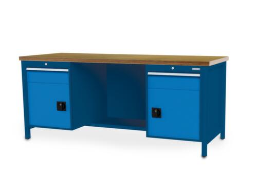 4-Fußgestell. Ausstattung: 2 Schubladen, 2 Schränke, 1/2 Ablageboden. Links 1 Schublade, 1 Schrank. Mitte 1/2 Ablageboden. Rechts 1 Schublade, 1 Schrank. Schubladen Höhe 2x150 mm. Schubladennutzmaß Breite x Tiefe 600 x 600 mm. Traglast je Schublade 100 kg. Schubladen mit kugelgelagerter Rollenführung, Auszug 100 %. Schubladen zur Aufnahme von Einteilungsmaterial geschlitzt. Mit Die Einzelauszugsperre verhindert, dass mehrere Schubladen gleichzeitig geöffnet werden und damit ein Umkippen. Griffleiste. Beschriftungsstreifen. Verschließbar mit Zylinderschloss. Konstruktion aus Stahl.