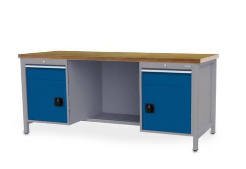 4-Fußgestell. Ausstattung: 2 Schubladen, 2 Schränke, 1/2 Ablageboden. Links 1 Schublade, 1 Schrank. Mitte 1/2 Ablageboden. Rechts 1 Schublade, 1 Schrank. Schubladen Höhe 2x150 mm. Schubladennutzmaß Breite x Tiefe 600 x 600 mm. Traglast je Schublade 100 kg. Schubladen mit kugelgelagerter Rollenführung, Auszug 100 %. Schubladen zur Aufnahme von Einteilungsmaterial geschlitzt. Mit Die Einzelauszugsperre verhindert, dass mehrere Schubladen gleichzeitig geöffnet werden und damit ein Umkippen. Griffleiste. Beschriftungsstreifen. Verschließbar mit Zylinderschloss. Konstruktion aus Stahl.