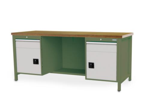 4-Fußgestell. Ausstattung: 2 Schubladen, 2 Schränke, 1/2 Ablageboden. Links 1 Schublade, 1 Schrank. Mitte 1/2 Ablageboden. Rechts 1 Schublade, 1 Schrank. Schubladen Höhe 2x150 mm. Schubladennutzmaß Breite x Tiefe 600 x 600 mm. Traglast je Schublade 100 kg. Schubladen mit kugelgelagerter Rollenführung, Auszug 100 %. Schubladen zur Aufnahme von Einteilungsmaterial geschlitzt. Mit Die Einzelauszugsperre verhindert, dass mehrere Schubladen gleichzeitig geöffnet werden und damit ein Umkippen. Griffleiste. Beschriftungsstreifen. Verschließbar mit Zylinderschloss. Konstruktion aus Stahl.