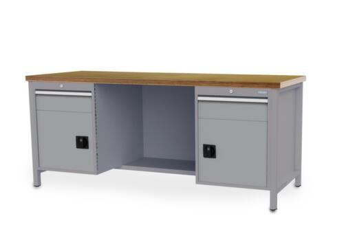 4-Fußgestell. Ausstattung: 2 Schubladen, 2 Schränke, 1/2 Ablageboden. Links 1 Schublade, 1 Schrank. Mitte 1/2 Ablageboden. Rechts 1 Schublade, 1 Schrank. Schubladen Höhe 2x150 mm. Schubladennutzmaß Breite x Tiefe 600 x 600 mm. Traglast je Schublade 100 kg. Schubladen mit kugelgelagerter Rollenführung, Auszug 100 %. Schubladen zur Aufnahme von Einteilungsmaterial geschlitzt. Mit Die Einzelauszugsperre verhindert, dass mehrere Schubladen gleichzeitig geöffnet werden und damit ein Umkippen. Griffleiste. Beschriftungsstreifen. Verschließbar mit Zylinderschloss. Konstruktion aus Stahl.