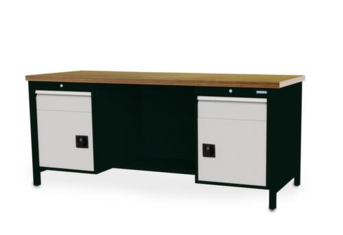 4-Fußgestell. Ausstattung: 2 Schubladen, 2 Schränke, 1/2 Ablageboden. Links 1 Schublade, 1 Schrank. Mitte 1/2 Ablageboden. Rechts 1 Schublade, 1 Schrank. Schubladen Höhe 2x150 mm. Schubladennutzmaß Breite x Tiefe 600 x 600 mm. Traglast je Schublade 100 kg. Schubladen mit kugelgelagerter Rollenführung, Auszug 100 %. Schubladen zur Aufnahme von Einteilungsmaterial geschlitzt. Mit Die Einzelauszugsperre verhindert, dass mehrere Schubladen gleichzeitig geöffnet werden und damit ein Umkippen. Griffleiste. Beschriftungsstreifen. Verschließbar mit Zylinderschloss. Konstruktion aus Stahl.
