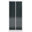Flügeltür. Verschließbar mit Zylinderschloss. Konstruktion aus Stahl, verschweißt. Korpus mit elektrostatischer Pulverbeschichtung in RAL7035 Lichtgrau. Front mit elektrostatischer Pulverbeschichtung in RAL7016 Anthrazitgrau.