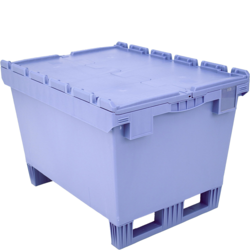 Im Euromaß. Aus bruchsicherem Polypropylen in taubenblau. Das Lagergut lässt sich durch die geschlossenen Wände vor Staub geschützt lagern und der Behälter lässt sich leicht reinigen. Boden geschlossen mit Verstärkung durch Doppelboden. Krokodildeckel. Für das einfache Versetzen und Einfahren mit einem Stapler sorgen die Kufen. Platzsparend ineinander stapelbar. Für Rollenbahnen geeignet.