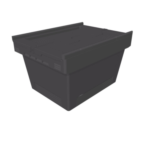 Aus Polypropylen-Regenerat. Das Lagergut lässt sich durch die geschlossenen Wände vor Staub geschützt lagern und der Behälter lässt sich leicht reinigen. Boden geschlossen. Zweiteiliger Klappdeckel in schwarz. Deckel aus Neugranulat. Mehrfach stapelbar. Mit offenem Deckel ineinander stapelbar.