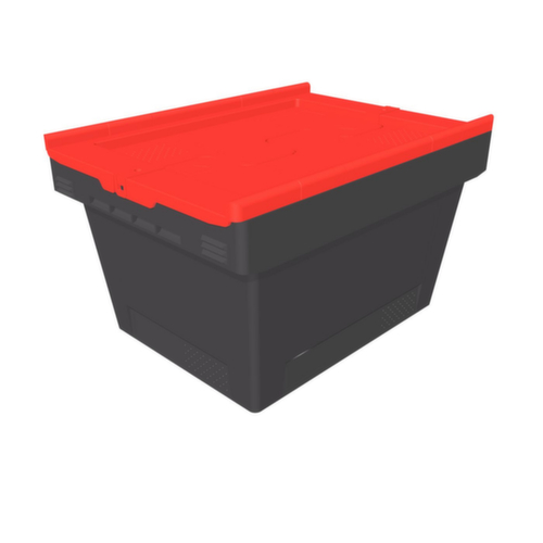 Aus Polypropylen-Regenerat. Das Lagergut lässt sich durch die geschlossenen Wände vor Staub geschützt lagern und der Behälter lässt sich leicht reinigen. Boden geschlossen. Zweiteiliger Klappdeckel in rot. Deckel aus Neugranulat. Mehrfach stapelbar. Mit offenem Deckel ineinander stapelbar.