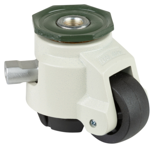 Mit verschleißfester, geräuscharmer Polyamid-Bereifung. Rad Ø 50 mm. Nabe mit stoßunempfindlichem und korrosionsbeständigem Gleitlager. Mit integriertem Nivellierfuß mit Ratschenverstellung zum Feststellen. Gehäuse aus Gussaluminium. Befestigung mit Rückenloch.
