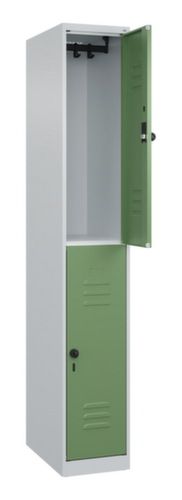 Die wichtigsten Maße des C+P Garderobenschranks Classic Plus auf einen Blick:Je Abteil 2 Schrankfächer mit je einer Kleiderstange und 3 verdrehsicheren Doppelschiebehaken. Flügeltür mit Etikettenrahmen und Lüftungsschlitzen. Die innenliegenden Drehbolzen der einschlagenden Türen bieten den Vorteil einer sauberen Optik, da keine Schrauben oder Scharniere von außen sichtbar sind. Dadurch wird das Design des Schrankes nicht beeinträchtigt und das gesamte Möbelstück wirkt hochwertiger. Damit ist auch die glatte Oberfläche leichter zu reinigen, da keine Schmutz- oder Staubablagerungen an unzugänglichen Stellen zu befürchten sind. Jede Tür ist serienmäßig mit einer Anschlagsdämpfung ausgestattet, so dass, auch durch ein schwungvolles Schließen, die Tür nicht zuknallt. Das trägt nicht nur zu einer angenehmeren Geräuschkulisse bei, sondern schont auch den Stahlschrank vor Beschädigungen. Von der Natur inspiriert schafft der BIONIC Steel Frame eine besonders effiziente und stabile Konstruktion. Durch eine raffinierte innere Struktur aus Faltungen, Streben und Zwischenräumen, sowie höhere Materialstärke an entscheidenden Stellen, wie z. B. im vorderen Bereich der Seitenwände und in den Trennwand- und Kastenprofilen, wird die Verwindungssteifigkeit zusätzlich erhöht. Verschließbar mit Sicherheits-Drehriegel für Vorhängeschloss. Das Sicherheitsschloss ist besonders aufbruchsicher, da es im verschlossenen Zustand durchdreht und erst nach Entfernung des Schlosses einrastet. Passend für alle Vorhängeschlösser mit einer Bügelstärke von 6 - 8 mm. Die zusätzlichen Lüftungsöffnungen im Abteil, kombiniert mit den Lüftungsschlitzen in der Tür, verbessern den Luftstrom. Dadurch wird der Schrankinhalt besser belüftet und trocknet schneller, ohne unangenehme Gerüche zu verursachen. Für eine besonders schlanke und raumsparende Optik steht der Schrank ohne Sockel oder Füße direkt auf dem Boden. Lediglich Bodenausgleichsschrauben sorgen für einen wackelfreien Stand bei eventuellen Bodenunebenheiten. Der Schrankboden ist für einen erhöhten Korrosionsschutz zusätzlich verzinkt. Konstruktion aus Stahl, stabil verschweißt. Das macht die Konstruktion besonders robust und widerstandsfähig und somit langlebiger. Die verschweißten Ecken und Kanten des Korpus gewährleisten eine höhere Dichtigkeit und somit eine bessere Schutzfunktion gegen Staub, Feuchtigkeit und Schmutz als eine geschraubte Konstruktion. Zudem sind keine regelmäßigen Wartungsarbeiten und Nachjustierungen nötig. Korpus mit Einbrennlackierung in RAL7035 Lichtgrau, Front mit Einbrennlackierung in RAL6011 Resedagrün.