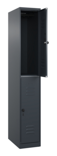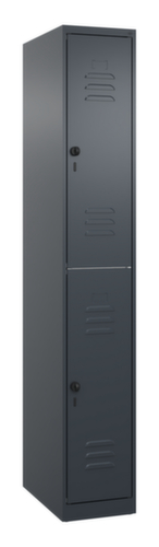 Die wichtigsten Maße des C+P Garderobenschranks Classic Plus auf einen Blick:Je Abteil 2 Schrankfächer mit je einer Kleiderstange und 3 verdrehsicheren Doppelschiebehaken. Flügeltür mit Etikettenrahmen und Lüftungsschlitzen. Die innenliegenden Drehbolzen der einschlagenden Türen bieten den Vorteil einer sauberen Optik, da keine Schrauben oder Scharniere von außen sichtbar sind. Dadurch wird das Design des Schrankes nicht beeinträchtigt und das gesamte Möbelstück wirkt hochwertiger. Damit ist auch die glatte Oberfläche leichter zu reinigen, da keine Schmutz- oder Staubablagerungen an unzugänglichen Stellen zu befürchten sind. Jede Tür ist serienmäßig mit einer Anschlagsdämpfung ausgestattet, so dass, auch durch ein schwungvolles Schließen, die Tür nicht zuknallt. Das trägt nicht nur zu einer angenehmeren Geräuschkulisse bei, sondern schont auch den Stahlschrank vor Beschädigungen. Von der Natur inspiriert schafft der BIONIC Steel Frame eine besonders effiziente und stabile Konstruktion. Durch eine raffinierte innere Struktur aus Faltungen, Streben und Zwischenräumen, sowie höhere Materialstärke an entscheidenden Stellen, wie z. B. im vorderen Bereich der Seitenwände und in den Trennwand- und Kastenprofilen, wird die Verwindungssteifigkeit zusätzlich erhöht. Verschließbar mit Sicherheits-Drehriegel für Vorhängeschloss. Das Sicherheitsschloss ist besonders aufbruchsicher, da es im verschlossenen Zustand durchdreht und erst nach Entfernung des Schlosses einrastet. Passend für alle Vorhängeschlösser mit einer Bügelstärke von 6 - 8 mm. Die zusätzlichen Lüftungsöffnungen im Abteil, kombiniert mit den Lüftungsschlitzen in der Tür, verbessern den Luftstrom. Dadurch wird der Schrankinhalt besser belüftet und trocknet schneller, ohne unangenehme Gerüche zu verursachen. Für eine besonders schlanke und raumsparende Optik steht der Schrank ohne Sockel oder Füße direkt auf dem Boden. Lediglich Bodenausgleichsschrauben sorgen für einen wackelfreien Stand bei eventuellen Bodenunebenheiten. Der Schrankboden ist für einen erhöhten Korrosionsschutz zusätzlich verzinkt. Konstruktion aus Stahl, stabil verschweißt. Das macht die Konstruktion besonders robust und widerstandsfähig und somit langlebiger. Die verschweißten Ecken und Kanten des Korpus gewährleisten eine höhere Dichtigkeit und somit eine bessere Schutzfunktion gegen Staub, Feuchtigkeit und Schmutz als eine geschraubte Konstruktion. Zudem sind keine regelmäßigen Wartungsarbeiten und Nachjustierungen nötig. Korpus mit Einbrennlackierung in RAL7016 Anthrazitgrau, Front mit Einbrennlackierung in RAL7016 Anthrazitgrau.