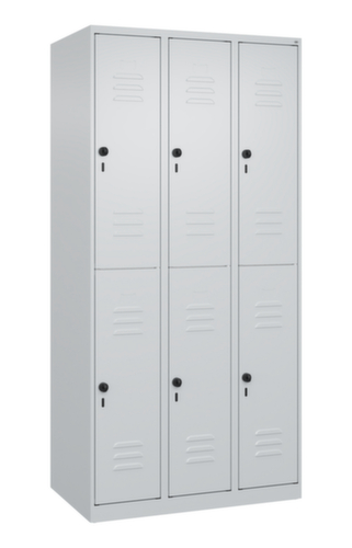Die wichtigsten Maße des C+P Garderobenschranks Classic Plus auf einen Blick:Je Abteil 2 Schrankfächer mit je einer Kleiderstange und 3 verdrehsicheren Doppelschiebehaken. Flügeltür mit Etikettenrahmen und Lüftungsschlitzen. Die innenliegenden Drehbolzen der einschlagenden Türen bieten den Vorteil einer sauberen Optik, da keine Schrauben oder Scharniere von außen sichtbar sind. Dadurch wird das Design des Schrankes nicht beeinträchtigt und das gesamte Möbelstück wirkt hochwertiger. Damit ist auch die glatte Oberfläche leichter zu reinigen, da keine Schmutz- oder Staubablagerungen an unzugänglichen Stellen zu befürchten sind. Jede Tür ist serienmäßig mit einer Anschlagsdämpfung ausgestattet, so dass, auch durch ein schwungvolles Schließen, die Tür nicht zuknallt. Das trägt nicht nur zu einer angenehmeren Geräuschkulisse bei, sondern schont auch den Stahlschrank vor Beschädigungen. Von der Natur inspiriert schafft der BIONIC Steel Frame eine besonders effiziente und stabile Konstruktion. Durch eine raffinierte innere Struktur aus Faltungen, Streben und Zwischenräumen, sowie höhere Materialstärke an entscheidenden Stellen, wie z. B. im vorderen Bereich der Seitenwände und in den Trennwand- und Kastenprofilen, wird die Verwindungssteifigkeit zusätzlich erhöht. Verschließbar mit Sicherheits-Drehriegel für Vorhängeschloss. Das Sicherheitsschloss ist besonders aufbruchsicher, da es im verschlossenen Zustand durchdreht und erst nach Entfernung des Schlosses einrastet. Passend für alle Vorhängeschlösser mit einer Bügelstärke von 6 - 8 mm. Die zusätzlichen Lüftungsöffnungen im Abteil, kombiniert mit den Lüftungsschlitzen in der Tür, verbessern den Luftstrom. Dadurch wird der Schrankinhalt besser belüftet und trocknet schneller, ohne unangenehme Gerüche zu verursachen. Für eine besonders schlanke und raumsparende Optik steht der Schrank ohne Sockel oder Füße direkt auf dem Boden. Lediglich Bodenausgleichsschrauben sorgen für einen wackelfreien Stand bei eventuellen Bodenunebenheiten. Der Schrankboden ist für einen erhöhten Korrosionsschutz zusätzlich verzinkt. Konstruktion aus Stahl, stabil verschweißt. Das macht die Konstruktion besonders robust und widerstandsfähig und somit langlebiger. Die verschweißten Ecken und Kanten des Korpus gewährleisten eine höhere Dichtigkeit und somit eine bessere Schutzfunktion gegen Staub, Feuchtigkeit und Schmutz als eine geschraubte Konstruktion. Zudem sind keine regelmäßigen Wartungsarbeiten und Nachjustierungen nötig. Korpus mit Einbrennlackierung in RAL7035 Lichtgrau, Front mit Einbrennlackierung in RAL7035 Lichtgrau.