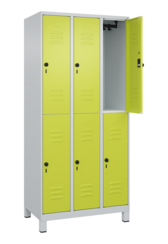 Die wichtigsten Maße des C+P Garderobenschranks Classic Plus auf einen Blick:Je Abteil 2 Schrankfächer mit je einer Kleiderstange und 3 verdrehsicheren Doppelschiebehaken. Flügeltür mit Etikettenrahmen und Lüftungsschlitzen. Die innenliegenden Drehbolzen der einschlagenden Türen bieten den Vorteil einer sauberen Optik, da keine Schrauben oder Scharniere von außen sichtbar sind. Dadurch wird das Design des Schrankes nicht beeinträchtigt und das gesamte Möbelstück wirkt hochwertiger. Damit ist auch die glatte Oberfläche leichter zu reinigen, da keine Schmutz- oder Staubablagerungen an unzugänglichen Stellen zu befürchten sind. Jede Tür ist serienmäßig mit einer Anschlagsdämpfung ausgestattet, so dass, auch durch ein schwungvolles Schließen, die Tür nicht zuknallt. Das trägt nicht nur zu einer angenehmeren Geräuschkulisse bei, sondern schont auch den Stahlschrank vor Beschädigungen. Von der Natur inspiriert schafft der BIONIC Steel Frame eine besonders effiziente und stabile Konstruktion. Durch eine raffinierte innere Struktur aus Faltungen, Streben und Zwischenräumen, sowie höhere Materialstärke an entscheidenden Stellen, wie z. B. im vorderen Bereich der Seitenwände und in den Trennwand- und Kastenprofilen, wird die Verwindungssteifigkeit zusätzlich erhöht. Verschließbar mit Sicherheits-Drehriegel für Vorhängeschloss. Das Sicherheitsschloss ist besonders aufbruchsicher, da es im verschlossenen Zustand durchdreht und erst nach Entfernung des Schlosses einrastet. Passend für alle Vorhängeschlösser mit einer Bügelstärke von 6 - 8 mm. Die zusätzlichen Lüftungsöffnungen im Abteil, kombiniert mit den Lüftungsschlitzen in der Tür, verbessern den Luftstrom. Dadurch wird der Schrankinhalt besser belüftet und trocknet schneller, ohne unangenehme Gerüche zu verursachen. Die untergebauten Füße aus Kunststoff verleihen dem Schrank nicht nur ein modernes und leichtes Erscheinungsbild und lassen ihn weniger massiv wirken, sondern bieten auch praktische Vorteile. Der offene Raum über dem Boden erleichtert die Reinigung und das Material Kunststoff bietet einen erhöhten Korrosionsschutz. Gerade in Umgebungen mit höheren Hygieneansprüchen ist dies ein wichtiger Aspekt. Konstruktion aus Stahl, stabil verschweißt. Das macht die Konstruktion besonders robust und widerstandsfähig und somit langlebiger. Die verschweißten Ecken und Kanten des Korpus gewährleisten eine höhere Dichtigkeit und somit eine bessere Schutzfunktion gegen Staub, Feuchtigkeit und Schmutz als eine geschraubte Konstruktion. Zudem sind keine regelmäßigen Wartungsarbeiten und Nachjustierungen nötig. Korpus mit Einbrennlackierung in RAL7035 Lichtgrau, Front mit Einbrennlackierung in RDS 110 80 60 Viridingrün.