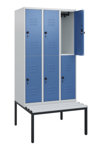 Die wichtigsten Maße des C+P Garderobenschranks Classic Plus auf einen Blick:Je Abteil 2 Schrankfächer mit je einer Kleiderstange und 3 verdrehsicheren Doppelschiebehaken. Flügeltür mit Etikettenrahmen und Lüftungsschlitzen. Die innenliegenden Drehbolzen der einschlagenden Türen bieten den Vorteil einer sauberen Optik, da keine Schrauben oder Scharniere von außen sichtbar sind. Dadurch wird das Design des Schrankes nicht beeinträchtigt und das gesamte Möbelstück wirkt hochwertiger. Damit ist auch die glatte Oberfläche leichter zu reinigen, da keine Schmutz- oder Staubablagerungen an unzugänglichen Stellen zu befürchten sind. Jede Tür ist serienmäßig mit einer Anschlagsdämpfung ausgestattet, so dass, auch durch ein schwungvolles Schließen, die Tür nicht zuknallt. Das trägt nicht nur zu einer angenehmeren Geräuschkulisse bei, sondern schont auch den Stahlschrank vor Beschädigungen. Von der Natur inspiriert schafft der BIONIC Steel Frame eine besonders effiziente und stabile Konstruktion. Durch eine raffinierte innere Struktur aus Faltungen, Streben und Zwischenräumen, sowie höhere Materialstärke an entscheidenden Stellen, wie z. B. im vorderen Bereich der Seitenwände und in den Trennwand- und Kastenprofilen, wird die Verwindungssteifigkeit zusätzlich erhöht. Verschließbar mit Sicherheits-Drehriegel für Vorhängeschloss. Das Sicherheitsschloss ist besonders aufbruchsicher, da es im verschlossenen Zustand durchdreht und erst nach Entfernung des Schlosses einrastet. Passend für alle Vorhängeschlösser mit einer Bügelstärke von 6 - 8 mm. Die zusätzlichen Lüftungsöffnungen im Abteil, kombiniert mit den Lüftungsschlitzen in der Tür, verbessern den Luftstrom. Dadurch wird der Schrankinhalt besser belüftet und trocknet schneller, ohne unangenehme Gerüche zu verursachen. Die untergebaute Sitzbank sorgt für eine effiziente Nutzung des verfügbaren Raumes. Sie ermöglicht ein bequemes An- und Ausziehen und bietet direkt noch Stauraum, ohne zusätzlichen Platz zu beanspruchen. Die Leisten sind aus Kunststoff. Konstruktion aus Stahl, stabil verschweißt. Das macht die Konstruktion besonders robust und widerstandsfähig und somit langlebiger. Die verschweißten Ecken und Kanten des Korpus gewährleisten eine höhere Dichtigkeit und somit eine bessere Schutzfunktion gegen Staub, Feuchtigkeit und Schmutz als eine geschraubte Konstruktion. Zudem sind keine regelmäßigen Wartungsarbeiten und Nachjustierungen nötig. Korpus mit Einbrennlackierung in RAL7035 Lichtgrau, Front mit Einbrennlackierung in RAL5023 Fernblau.