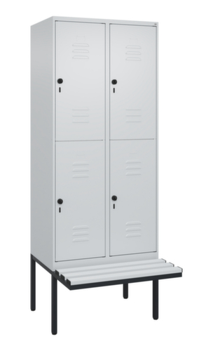 Die wichtigsten Maße des C+P Garderobenschranks Classic Plus auf einen Blick:Je Abteil 2 Schrankfächer mit je einer Kleiderstange und 3 verdrehsicheren Doppelschiebehaken. Flügeltür mit Etikettenrahmen und Lüftungsschlitzen. Die innenliegenden Drehbolzen der einschlagenden Türen bieten den Vorteil einer sauberen Optik, da keine Schrauben oder Scharniere von außen sichtbar sind. Dadurch wird das Design des Schrankes nicht beeinträchtigt und das gesamte Möbelstück wirkt hochwertiger. Damit ist auch die glatte Oberfläche leichter zu reinigen, da keine Schmutz- oder Staubablagerungen an unzugänglichen Stellen zu befürchten sind. Jede Tür ist serienmäßig mit einer Anschlagsdämpfung ausgestattet, so dass, auch durch ein schwungvolles Schließen, die Tür nicht zuknallt. Das trägt nicht nur zu einer angenehmeren Geräuschkulisse bei, sondern schont auch den Stahlschrank vor Beschädigungen. Von der Natur inspiriert schafft der BIONIC Steel Frame eine besonders effiziente und stabile Konstruktion. Durch eine raffinierte innere Struktur aus Faltungen, Streben und Zwischenräumen, sowie höhere Materialstärke an entscheidenden Stellen, wie z. B. im vorderen Bereich der Seitenwände und in den Trennwand- und Kastenprofilen, wird die Verwindungssteifigkeit zusätzlich erhöht. Verschließbar mit Sicherheits-Drehriegel für Vorhängeschloss. Das Sicherheitsschloss ist besonders aufbruchsicher, da es im verschlossenen Zustand durchdreht und erst nach Entfernung des Schlosses einrastet. Passend für alle Vorhängeschlösser mit einer Bügelstärke von 6 - 8 mm. Die zusätzlichen Lüftungsöffnungen im Abteil, kombiniert mit den Lüftungsschlitzen in der Tür, verbessern den Luftstrom. Dadurch wird der Schrankinhalt besser belüftet und trocknet schneller, ohne unangenehme Gerüche zu verursachen. Die schwebende Sitzbank bietet mehr Freiraum für ein bequemes An- und Ausziehen, ohne dass die Füße des Gestells im Weg sind. Die Leisten sind aus Kunststoff. Konstruktion aus Stahl, stabil verschweißt. Das macht die Konstruktion besonders robust und widerstandsfähig und somit langlebiger. Die verschweißten Ecken und Kanten des Korpus gewährleisten eine höhere Dichtigkeit und somit eine bessere Schutzfunktion gegen Staub, Feuchtigkeit und Schmutz als eine geschraubte Konstruktion. Zudem sind keine regelmäßigen Wartungsarbeiten und Nachjustierungen nötig. Korpus mit Einbrennlackierung in RAL7035 Lichtgrau, Front mit Einbrennlackierung in RAL7035 Lichtgrau.