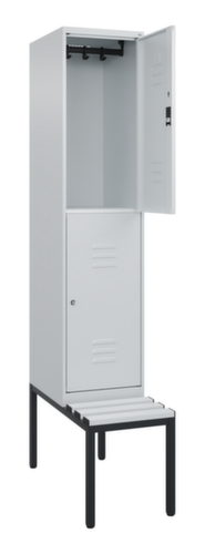 Die wichtigsten Maße des C+P Garderobenschranks Classic Plus auf einen Blick:Je Abteil 2 Schrankfächer mit je einer Kleiderstange und 3 verdrehsicheren Doppelschiebehaken. Flügeltür mit Etikettenrahmen und Lüftungsschlitzen. Die innenliegenden Drehbolzen der einschlagenden Türen bieten den Vorteil einer sauberen Optik, da keine Schrauben oder Scharniere von außen sichtbar sind. Dadurch wird das Design des Schrankes nicht beeinträchtigt und das gesamte Möbelstück wirkt hochwertiger. Damit ist auch die glatte Oberfläche leichter zu reinigen, da keine Schmutz- oder Staubablagerungen an unzugänglichen Stellen zu befürchten sind. Jede Tür ist serienmäßig mit einer Anschlagsdämpfung ausgestattet, so dass, auch durch ein schwungvolles Schließen, die Tür nicht zuknallt. Das trägt nicht nur zu einer angenehmeren Geräuschkulisse bei, sondern schont auch den Stahlschrank vor Beschädigungen. Von der Natur inspiriert schafft der BIONIC Steel Frame eine besonders effiziente und stabile Konstruktion. Durch eine raffinierte innere Struktur aus Faltungen, Streben und Zwischenräumen, sowie höhere Materialstärke an entscheidenden Stellen, wie z. B. im vorderen Bereich der Seitenwände und in den Trennwand- und Kastenprofilen, wird die Verwindungssteifigkeit zusätzlich erhöht. Verschließbar mit Zylinderschloss. Die zusätzlichen Lüftungsöffnungen im Abteil, kombiniert mit den Lüftungsschlitzen in der Tür, verbessern den Luftstrom. Dadurch wird der Schrankinhalt besser belüftet und trocknet schneller, ohne unangenehme Gerüche zu verursachen. Die untergebaute Sitzbank sorgt für eine effiziente Nutzung des verfügbaren Raumes. Sie ermöglicht ein bequemes An- und Ausziehen und bietet direkt noch Stauraum, ohne zusätzlichen Platz zu beanspruchen. Die Leisten sind aus Kunststoff. Konstruktion aus Stahl, stabil verschweißt. Das macht die Konstruktion besonders robust und widerstandsfähig und somit langlebiger. Die verschweißten Ecken und Kanten des Korpus gewährleisten eine höhere Dichtigkeit und somit eine bessere Schutzfunktion gegen Staub, Feuchtigkeit und Schmutz als eine geschraubte Konstruktion. Zudem sind keine regelmäßigen Wartungsarbeiten und Nachjustierungen nötig. Korpus mit Einbrennlackierung in RAL7035 Lichtgrau, Front mit Einbrennlackierung in RAL7035 Lichtgrau.