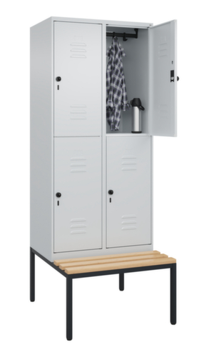 Die wichtigsten Maße des C+P Garderobenschranks Classic Plus auf einen Blick:Je Abteil 2 Schrankfächer mit je einer Kleiderstange und 3 verdrehsicheren Doppelschiebehaken. Flügeltür mit Etikettenrahmen und Lüftungsschlitzen. Die innenliegenden Drehbolzen der einschlagenden Türen bieten den Vorteil einer sauberen Optik, da keine Schrauben oder Scharniere von außen sichtbar sind. Dadurch wird das Design des Schrankes nicht beeinträchtigt und das gesamte Möbelstück wirkt hochwertiger. Damit ist auch die glatte Oberfläche leichter zu reinigen, da keine Schmutz- oder Staubablagerungen an unzugänglichen Stellen zu befürchten sind. Jede Tür ist serienmäßig mit einer Anschlagsdämpfung ausgestattet, so dass, auch durch ein schwungvolles Schließen, die Tür nicht zuknallt. Das trägt nicht nur zu einer angenehmeren Geräuschkulisse bei, sondern schont auch den Stahlschrank vor Beschädigungen. Von der Natur inspiriert schafft der BIONIC Steel Frame eine besonders effiziente und stabile Konstruktion. Durch eine raffinierte innere Struktur aus Faltungen, Streben und Zwischenräumen, sowie höhere Materialstärke an entscheidenden Stellen, wie z. B. im vorderen Bereich der Seitenwände und in den Trennwand- und Kastenprofilen, wird die Verwindungssteifigkeit zusätzlich erhöht. Verschließbar mit Sicherheits-Drehriegel für Vorhängeschloss. Das Sicherheitsschloss ist besonders aufbruchsicher, da es im verschlossenen Zustand durchdreht und erst nach Entfernung des Schlosses einrastet. Passend für alle Vorhängeschlösser mit einer Bügelstärke von 6 - 8 mm. Die zusätzlichen Lüftungsöffnungen im Abteil, kombiniert mit den Lüftungsschlitzen in der Tür, verbessern den Luftstrom. Dadurch wird der Schrankinhalt besser belüftet und trocknet schneller, ohne unangenehme Gerüche zu verursachen. Die untergebaute Sitzbank sorgt für eine effiziente Nutzung des verfügbaren Raumes. Sie ermöglicht ein bequemes An- und Ausziehen und bietet direkt noch Stauraum, ohne zusätzlichen Platz zu beanspruchen. Die Leisten sind aus Buchenholz. Konstruktion aus Stahl, stabil verschweißt. Das macht die Konstruktion besonders robust und widerstandsfähig und somit langlebiger. Die verschweißten Ecken und Kanten des Korpus gewährleisten eine höhere Dichtigkeit und somit eine bessere Schutzfunktion gegen Staub, Feuchtigkeit und Schmutz als eine geschraubte Konstruktion. Zudem sind keine regelmäßigen Wartungsarbeiten und Nachjustierungen nötig. Korpus mit Einbrennlackierung in RAL7035 Lichtgrau, Front mit Einbrennlackierung in RAL7035 Lichtgrau.