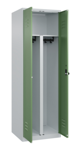 . Die wichtigsten Maße des C+P Garderobenschranks Classic Plus auf einen Blick:Je Abteil 1 stabile Garderobenstange aus Ovalprofil mit 3 verdrehsicheren Doppelschiebehaken, oberhalb ein durchgehender Hutboden über je 2 Abteile. Diese extra breite Ablage bietet den idealen Stauraum für PSA-Ausrüstung wie z. B. Helme, Augen- oder Gehörschutz. Doppel-Flügeltür mit Lüftungsschlitzen und Etikettenrahmen. Die innenliegenden Drehbolzen der einschlagenden Türen bieten den Vorteil einer sauberen Optik, da keine Schrauben oder Scharniere von außen sichtbar sind. Dadurch wird das Design des Schrankes nicht beeinträchtigt und das gesamte Möbelstück wirkt hochwertiger. Damit ist auch die glatte Oberfläche leichter zu reinigen, da keine Schmutz- oder Staubablagerungen an unzugänglichen Stellen zu befürchten sind. Jede Tür ist serienmäßig mit einer Anschlagsdämpfung ausgestattet, so dass, auch durch ein schwungvolles Schließen, die Tür nicht zuknallt. Das trägt nicht nur zu einer angenehmeren Geräuschkulisse bei, sondern schont auch den Stahlschrank vor Beschädigungen. Von der Natur inspiriert schafft der BIONIC Steel Frame eine besonders effiziente und stabile Konstruktion. Durch eine raffinierte innere Struktur aus Faltungen, Streben und Zwischenräumen, sowie höhere Materialstärke an entscheidenden Stellen, wie z. B. im vorderen Bereich der Seitenwände und in den Trennwand- und Kastenprofilen, wird die Verwindungssteifigkeit zusätzlich erhöht. Verschließbar mit Sicherheits-Drehriegel für Vorhängeschloss. Das Sicherheitsschloss ist besonders aufbruchsicher, da es im verschlossenen Zustand durchdreht und erst nach Entfernung des Schlosses einrastet. Passend für alle Vorhängeschlösser mit einer Bügelstärke von 6 - 8 mm. Pro Person stehen 2 Abteile zur Verfügung, die über die zueinander schlagenden Türen gemeinsam verschließbar sind. Dadurch ist eine strikte und saubere Trennung von Arbeits- und Alltagskleidung ganz einfach möglich. Die zusätzlichen Lüftungsöffnungen im Abteil, kombiniert mit den Lüftungsschlitzen in der Tür, verbessern den Luftstrom. Dadurch wird der Schrankinhalt besser belüftet und trocknet schneller, ohne unangenehme Gerüche zu verursachen. Für eine besonders schlanke und raumsparende Optik steht der Schrank ohne Sockel oder Füße direkt auf dem Boden. Lediglich Bodenausgleichsschrauben sorgen für einen wackelfreien Stand bei eventuellen Bodenunebenheiten. Der Schrankboden ist für einen erhöhten Korrosionsschutz zusätzlich verzinkt. Konstruktion aus Stahl, stabil verschweißt. Das macht die Konstruktion besonders robust und widerstandsfähig und somit langlebiger. Die verschweißten Ecken und Kanten des Korpus gewährleisten eine höhere Dichtigkeit und somit eine bessere Schutzfunktion gegen Staub, Feuchtigkeit und Schmutz als eine geschraubte Konstruktion. Zudem sind keine regelmäßigen Wartungsarbeiten und Nachjustierungen nötig. Korpus mit Einbrennlackierung in RAL7035 Lichtgrau, Front mit Einbrennlackierung in RAL6011 Resedagrün.