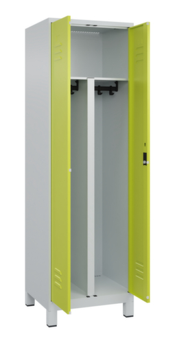 . Die wichtigsten Maße des C+P Garderobenschranks Classic Plus auf einen Blick:Je Abteil 1 stabile Garderobenstange aus Ovalprofil mit 3 verdrehsicheren Doppelschiebehaken, oberhalb ein durchgehender Hutboden über je 2 Abteile. Diese extra breite Ablage bietet den idealen Stauraum für PSA-Ausrüstung wie z. B. Helme, Augen- oder Gehörschutz. Doppel-Flügeltür mit Lüftungsschlitzen und Etikettenrahmen. Die innenliegenden Drehbolzen der einschlagenden Türen bieten den Vorteil einer sauberen Optik, da keine Schrauben oder Scharniere von außen sichtbar sind. Dadurch wird das Design des Schrankes nicht beeinträchtigt und das gesamte Möbelstück wirkt hochwertiger. Damit ist auch die glatte Oberfläche leichter zu reinigen, da keine Schmutz- oder Staubablagerungen an unzugänglichen Stellen zu befürchten sind. Jede Tür ist serienmäßig mit einer Anschlagsdämpfung ausgestattet, so dass, auch durch ein schwungvolles Schließen, die Tür nicht zuknallt. Das trägt nicht nur zu einer angenehmeren Geräuschkulisse bei, sondern schont auch den Stahlschrank vor Beschädigungen. Von der Natur inspiriert schafft der BIONIC Steel Frame eine besonders effiziente und stabile Konstruktion. Durch eine raffinierte innere Struktur aus Faltungen, Streben und Zwischenräumen, sowie höhere Materialstärke an entscheidenden Stellen, wie z. B. im vorderen Bereich der Seitenwände und in den Trennwand- und Kastenprofilen, wird die Verwindungssteifigkeit zusätzlich erhöht. Verschließbar mit Zylinderschloss. Pro Person stehen 2 Abteile zur Verfügung, die über die zueinander schlagenden Türen gemeinsam verschließbar sind. Dadurch ist eine strikte und saubere Trennung von Arbeits- und Alltagskleidung ganz einfach möglich. Die zusätzlichen Lüftungsöffnungen im Abteil, kombiniert mit den Lüftungsschlitzen in der Tür, verbessern den Luftstrom. Dadurch wird der Schrankinhalt besser belüftet und trocknet schneller, ohne unangenehme Gerüche zu verursachen. Die untergebauten Füße aus Kunststoff verleihen dem Schrank nicht nur ein modernes und leichtes Erscheinungsbild und lassen ihn weniger massiv wirken, sondern bieten auch praktische Vorteile. Der offene Raum über dem Boden erleichtert die Reinigung und das Material Kunststoff bietet einen erhöhten Korrosionsschutz. Gerade in Umgebungen mit höheren Hygieneansprüchen ist dies ein wichtiger Aspekt. Konstruktion aus Stahl, stabil verschweißt. Das macht die Konstruktion besonders robust und widerstandsfähig und somit langlebiger. Die verschweißten Ecken und Kanten des Korpus gewährleisten eine höhere Dichtigkeit und somit eine bessere Schutzfunktion gegen Staub, Feuchtigkeit und Schmutz als eine geschraubte Konstruktion. Zudem sind keine regelmäßigen Wartungsarbeiten und Nachjustierungen nötig. Korpus mit Einbrennlackierung in RAL7035 Lichtgrau, Front mit Einbrennlackierung in RDS 110 80 60 Viridingrün.