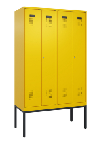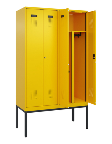 . Die wichtigsten Maße des C+P Garderobenschranks Evolo PLUS auf einen Blick:Je Abteil 1 stabile Garderobenstange aus Ovalprofil mit 3 verdrehsicheren Doppelschiebehaken, oberhalb ein durchgehender Hutboden über je 2 Abteile. Diese extra breite Ablage bietet den idealen Stauraum für PSA-Ausrüstung wie z. B. Helme, Augen- oder Gehörschutz. Die Doppel-Flügeltüren können über den Comfort-Etikettrahmen ganz einfach personalisiert werden. Dank des Desinglochbildes, was essentiell zur Belüftung beiträgt, bleibt der Schrank trotzdem in seinem gesamten Erscheinungsbild glatt, hygienisch und leicht zu reinigen. Die innenliegenden Drehbolzen der einschlagenden Türen bieten den Vorteil einer sauberen Optik, da keine Schrauben oder Scharniere von außen sichtbar sind. Dadurch wird das Design des Schrankes nicht beeinträchtigt und das gesamte Möbelstück wirkt hochwertiger. Damit ist auch die glatte Oberfläche leichter zu reinigen, da keine Schmutz- oder Staubablagerungen an unzugänglichen Stellen zu befürchten sind. Jede Tür ist serienmäßig mit einer Anschlagsdämpfung ausgestattet, so dass, auch durch ein schwungvolles Schließen, die Tür nicht zuknallt. Das trägt nicht nur zu einer angenehmeren Geräuschkulisse bei, sondern schont auch den Stahlschrank vor Beschädigungen. Von der Natur inspiriert schafft der BIONIC Steel Frame eine besonders effiziente und stabile Konstruktion. Durch eine raffinierte innere Struktur aus Faltungen, Streben und Zwischenräumen, sowie höhere Materialstärke an entscheidenden Stellen, wie z. B. im vorderen Bereich der Seitenwände und in den Trennwand- und Kastenprofilen, wird die Verwindungssteifigkeit zusätzlich erhöht. Verschließbar mit Zylinderschloss. Pro Person stehen 2 Abteile zur Verfügung, die über die zueinander schlagenden Türen gemeinsam verschließbar sind. Dadurch ist eine strikte und saubere Trennung von Arbeits- und Alltagskleidung ganz einfach möglich. Das durchdachte Selbstbelüftungskonzept ermöglicht einen konstruktiv optimierte Luftzirkulation. Definierte Lüftungsfreiräume vor und hinter dem Ablageboden, Lüftungsöffnungen in Abteilboden und -dach, in Kombination mit dem Lochbild in der Tür, tragen zu einer angenehmen Strömungsverlauf bei. . Dadurch wird der Schrankinhalt ausreichend belüftet und trocknet schneller, ohne unangenehme Gerüche zu verursachen. Das untergebaute Fußgestell reduziert mögliche Ansammlungen von Schmutz und Staub, da eine vollflächige Reinigung einfach möglich ist. Zudem wird zusätzlicher Stauraum unter dem Schrank geschaffen. Schuhe und Taschen stehen nicht mehr im Raum und stellen weniger Stolpergefahr dar. Konstruktion aus Stahl, stabil verschweißt. Das macht die Konstruktion besonders robust und widerstandsfähig und somit langlebiger. Die verschweißten Ecken und Kanten des Korpus gewährleisten eine höhere Dichtigkeit und somit eine bessere Schutzfunktion gegen Staub, Feuchtigkeit und Schmutz als eine geschraubte Konstruktion. Zudem sind keine regelmäßigen Wartungsarbeiten und Nachjustierungen nötig. Korpus mit Einbrennlackierung in RAL1023 Verkehrsgelb, Front mit Einbrennlackierung in RAL1023 Verkehrsgelb.