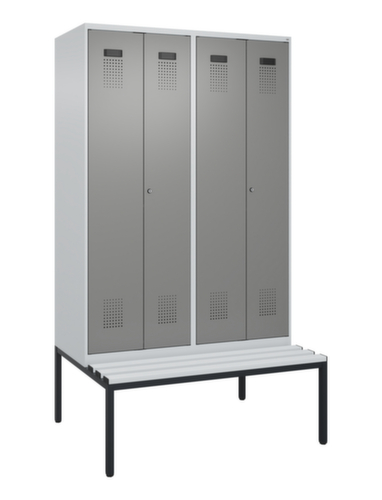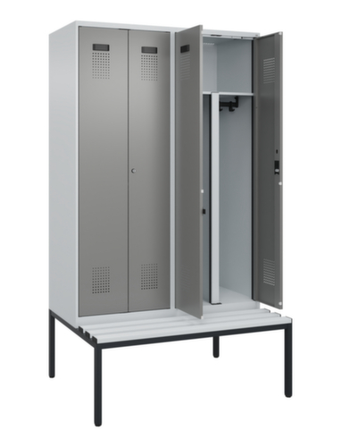 Die wichtigsten Maße des C+P Garderobenschranks Evolo PLUS auf einen Blick:Je Abteil 1 stabile Garderobenstange aus Ovalprofil mit 3 verdrehsicheren Doppelschiebehaken, oberhalb ein durchgehender Hutboden über je 2 Abteile. Diese extra breite Ablage bietet den idealen Stauraum für PSA-Ausrüstung wie z. B. Helme, Augen- oder Gehörschutz. Die Doppel-Flügeltüren können über den Comfort-Etikettrahmen ganz einfach personalisiert werden. Dank des Desinglochbildes, was essentiell zur Belüftung beiträgt, bleibt der Schrank trotzdem in seinem gesamten Erscheinungsbild glatt, hygienisch und leicht zu reinigen. Die innenliegenden Drehbolzen der einschlagenden Türen bieten den Vorteil einer sauberen Optik, da keine Schrauben oder Scharniere von außen sichtbar sind. Dadurch wird das Design des Schrankes nicht beeinträchtigt und das gesamte Möbelstück wirkt hochwertiger. Damit ist auch die glatte Oberfläche leichter zu reinigen, da keine Schmutz- oder Staubablagerungen an unzugänglichen Stellen zu befürchten sind. Jede Tür ist serienmäßig mit einer Anschlagsdämpfung ausgestattet, so dass, auch durch ein schwungvolles Schließen, die Tür nicht zuknallt. Das trägt nicht nur zu einer angenehmeren Geräuschkulisse bei, sondern schont auch den Stahlschrank vor Beschädigungen. Von der Natur inspiriert schafft der BIONIC Steel Frame eine besonders effiziente und stabile Konstruktion. Durch eine raffinierte innere Struktur aus Faltungen, Streben und Zwischenräumen, sowie höhere Materialstärke an entscheidenden Stellen, wie z. B. im vorderen Bereich der Seitenwände und in den Trennwand- und Kastenprofilen, wird die Verwindungssteifigkeit zusätzlich erhöht. Pro Person stehen 2 Abteile zur Verfügung, die über die zueinander schlagenden Türen gemeinsam verschließbar sind. Dadurch ist eine strikte und saubere Trennung von Arbeits- und Alltagskleidung ganz einfach möglich. Das durchdachte Selbstbelüftungskonzept ermöglicht einen konstruktiv optimierte Luftzirkulation. Definierte Lüftungsfreiräume vor und hinter dem Ablageboden, Lüftungsöffnungen in Abteilboden und -dach, in Kombination mit dem Lochbild in der Tür, tragen zu einer angenehmen Strömungsverlauf bei. . Dadurch wird der Schrankinhalt ausreichend belüftet und trocknet schneller, ohne unangenehme Gerüche zu verursachen. Die untergebaute Sitzbank sorgt für eine effiziente Nutzung des verfügbaren Raumes. Sie ermöglicht ein bequemes An- und Ausziehen und bietet direkt noch Stauraum, ohne zusätzlichen Platz zu beanspruchen. Die Leisten sind aus Kunststoff mit Stahlkern - hygienische, pflegeleichte und zugleich extrem stabile Sitzfläche. Durch ihre hohe Belastbarkeit und Langlebigkeit besonders für stark frequentierte Umkleiden geeignet. Das untergebaute Fußgestell reduziert mögliche Ansammlungen von Schmutz und Staub, da eine vollflächige Reinigung einfach möglich ist. Zudem wird zusätzlicher Stauraum unter dem Schrank geschaffen. Schuhe und Taschen stehen nicht mehr im Raum und stellen weniger Stolpergefahr dar. Konstruktion aus Stahl, stabil verschweißt. Das macht die Konstruktion besonders robust und widerstandsfähig und somit langlebiger. Die verschweißten Ecken und Kanten des Korpus gewährleisten eine höhere Dichtigkeit und somit eine bessere Schutzfunktion gegen Staub, Feuchtigkeit und Schmutz als eine geschraubte Konstruktion. Zudem sind keine regelmäßigen Wartungsarbeiten und Nachjustierungen nötig. Korpus mit Einbrennlackierung in RAL7035 Lichtgrau, Front mit Einbrennlackierung in RAL0005000 Stahlgrau.