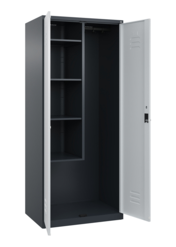 Die wichtigsten Details des C+P Putzmittelschrankes Classic Plus auf einen Blick:Über die Doppelflügeltür ist der Zugriff auf den Schrankinhalt besonders komfortabel. Die Lüftungsschlitze sorgen für eine erhöhte Belüftung und schützen somit den Inhalt des Schranks vor Feuchtigkeit und Schimmelbildung, da eine gute Luftzirkulation die Feuchtigkeit reduziert. Die innenliegenden Drehbolzen der einschlagenden Türen bieten den Vorteil einer sauberen Optik, da keine Schrauben oder Scharniere von außen sichtbar sind. Dadurch wird das Design des Schrankes nicht beeinträchtigt und das gesamte Möbelstück wirkt hochwertiger. Damit ist auch die glatte Oberfläche leichter zu reinigen, da keine Schmutz- oder Staubablagerungen an unzugänglichen Stellen zu befürchten sind. Jede Tür ist serienmäßig mit einer Anschlagsdämpfung ausgestattet, so dass, auch durch ein schwungvolles Schließen, die Tür nicht zuknallt. Das trägt nicht nur zu einer angenehmeren Geräuschkulisse bei, sondern schont auch den Stahlschrank vor Beschädigungen. 4 Ebene(n) mit Ablageboden. Die verkürzte Mitteltrennwand unterteilt den Schrank in zwei separate Bereiche, die auf verschiedene Arten und für unterschiedlich große Gegenstände genutzt werden können, lässt dabei im unteren Bereich jedoch Platz für Putzeimer oder andere Reinigungsgeräte. Links ausgestattet mit 4 Fächer mit festen Fachböden, rechts mit 1 stabile Garderobenstange aus Ovalprofil mit 4 verdrehsicheren Doppelschiebehaken. verschließbar mit Sicherheits-Drehriegel für Vorhängeschloss. Das Sicherheitsschloss ist besonders aufbruchsicher, da es im verschlossenen Zustand durchdreht und erst nach Entfernung des Schlosses einrastet. Türen gemeinsam verschließbar. Die zusätzlichen Lüftungsöffnungen im Abteil, kombiniert mit den Lüftungsschlitzen in der Tür, verbessern den Luftstrom. Dadurch wird der Schrankinhalt besser belüftet und trocknet schneller, ohne unangenehme Gerüche zu verursachen. Für eine besonders schlanke und raumsparende Optik steht der Schrank ohne Sockel oder Füße direkt auf dem Boden. Lediglich Bodenausgleichsschrauben sorgen für einen wackelfreien Stand bei eventuellen Bodenunebenheiten. Der Schrankboden ist für einen erhöhten Korrosionsschutz zusätzlich verzinkt. Korpus mit Einbrennlackierung in RAL7016 Anthrazitgrau. Front mit Einbrennlackierung in RAL7016 Anthrazitgrau.