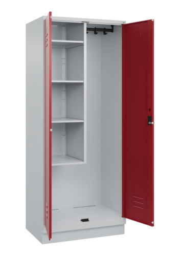 Die wichtigsten Details des C+P Putzmittelschrankes Classic Plus auf einen Blick:Über die Doppelflügeltür ist der Zugriff auf den Schrankinhalt besonders komfortabel. Die Lüftungsschlitze sorgen für eine erhöhte Belüftung und schützen somit den Inhalt des Schranks vor Feuchtigkeit und Schimmelbildung, da eine gute Luftzirkulation die Feuchtigkeit reduziert. Die innenliegenden Drehbolzen der einschlagenden Türen bieten den Vorteil einer sauberen Optik, da keine Schrauben oder Scharniere von außen sichtbar sind. Dadurch wird das Design des Schrankes nicht beeinträchtigt und das gesamte Möbelstück wirkt hochwertiger. Damit ist auch die glatte Oberfläche leichter zu reinigen, da keine Schmutz- oder Staubablagerungen an unzugänglichen Stellen zu befürchten sind. Jede Tür ist serienmäßig mit einer Anschlagsdämpfung ausgestattet, so dass, auch durch ein schwungvolles Schließen, die Tür nicht zuknallt. Das trägt nicht nur zu einer angenehmeren Geräuschkulisse bei, sondern schont auch den Stahlschrank vor Beschädigungen. 4 Ebene(n) mit Ablageboden. Die verkürzte Mitteltrennwand unterteilt den Schrank in zwei separate Bereiche, die auf verschiedene Arten und für unterschiedlich große Gegenstände genutzt werden können, lässt dabei im unteren Bereich jedoch Platz für Putzeimer oder andere Reinigungsgeräte. Links ausgestattet mit 4 Fächer mit festen Fachböden, rechts mit 1 stabile Garderobenstange aus Ovalprofil mit 4 verdrehsicheren Doppelschiebehaken. verschließbar mit Sicherheits-Drehriegel für Vorhängeschloss. Das Sicherheitsschloss ist besonders aufbruchsicher, da es im verschlossenen Zustand durchdreht und erst nach Entfernung des Schlosses einrastet. Türen gemeinsam verschließbar. Die zusätzlichen Lüftungsöffnungen im Abteil, kombiniert mit den Lüftungsschlitzen in der Tür, verbessern den Luftstrom. Dadurch wird der Schrankinhalt besser belüftet und trocknet schneller, ohne unangenehme Gerüche zu verursachen. Der untergebaute Sockel sorgt dafür, dass das Gewicht des Schrankes gleichmäßig auf dem Boden verteilt wird. Dies erhöht die Stabilität und der Schrank kann schwerer Lasten aufnehmen, als ein Schrank mit Füßen. Außerdem können Schmutz, Staub und Feuchtigkeit nicht unter den Schrank gelangen, was die Reinigungsfläche verkleinert. Korpus mit Einbrennlackierung in RAL7035 Lichtgrau. Front mit Einbrennlackierung in RAL3003 Rubinrot.