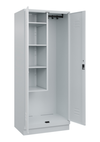 Die wichtigsten Details des C+P Putzmittelschrankes Classic Plus auf einen Blick:Über die Doppelflügeltür ist der Zugriff auf den Schrankinhalt besonders komfortabel. Die Lüftungsschlitze sorgen für eine erhöhte Belüftung und schützen somit den Inhalt des Schranks vor Feuchtigkeit und Schimmelbildung, da eine gute Luftzirkulation die Feuchtigkeit reduziert. Die innenliegenden Drehbolzen der einschlagenden Türen bieten den Vorteil einer sauberen Optik, da keine Schrauben oder Scharniere von außen sichtbar sind. Dadurch wird das Design des Schrankes nicht beeinträchtigt und das gesamte Möbelstück wirkt hochwertiger. Damit ist auch die glatte Oberfläche leichter zu reinigen, da keine Schmutz- oder Staubablagerungen an unzugänglichen Stellen zu befürchten sind. Jede Tür ist serienmäßig mit einer Anschlagsdämpfung ausgestattet, so dass, auch durch ein schwungvolles Schließen, die Tür nicht zuknallt. Das trägt nicht nur zu einer angenehmeren Geräuschkulisse bei, sondern schont auch den Stahlschrank vor Beschädigungen. 4 Ebene(n) mit Ablageboden. Die verkürzte Mitteltrennwand unterteilt den Schrank in zwei separate Bereiche, die auf verschiedene Arten und für unterschiedlich große Gegenstände genutzt werden können, lässt dabei im unteren Bereich jedoch Platz für Putzeimer oder andere Reinigungsgeräte. Links ausgestattet mit 4 Fächer mit festen Fachböden, rechts mit 1 stabile Garderobenstange aus Ovalprofil mit 4 verdrehsicheren Doppelschiebehaken. verschließbar mit Zylinderschloss. Türen gemeinsam verschließbar. Die zusätzlichen Lüftungsöffnungen im Abteil, kombiniert mit den Lüftungsschlitzen in der Tür, verbessern den Luftstrom. Dadurch wird der Schrankinhalt besser belüftet und trocknet schneller, ohne unangenehme Gerüche zu verursachen. Der untergebaute Sockel sorgt dafür, dass das Gewicht des Schrankes gleichmäßig auf dem Boden verteilt wird. Dies erhöht die Stabilität und der Schrank kann schwerer Lasten aufnehmen, als ein Schrank mit Füßen. Außerdem können Schmutz, Staub und Feuchtigkeit nicht unter den Schrank gelangen, was die Reinigungsfläche verkleinert. Korpus mit Einbrennlackierung in RAL7035 Lichtgrau. Front mit Einbrennlackierung in RAL7035 Lichtgrau.