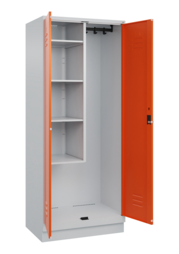 Die wichtigsten Details des C+P Putzmittelschrankes Classic Plus auf einen Blick:Über die Doppelflügeltür ist der Zugriff auf den Schrankinhalt besonders komfortabel. Die Lüftungsschlitze sorgen für eine erhöhte Belüftung und schützen somit den Inhalt des Schranks vor Feuchtigkeit und Schimmelbildung, da eine gute Luftzirkulation die Feuchtigkeit reduziert. Die innenliegenden Drehbolzen der einschlagenden Türen bieten den Vorteil einer sauberen Optik, da keine Schrauben oder Scharniere von außen sichtbar sind. Dadurch wird das Design des Schrankes nicht beeinträchtigt und das gesamte Möbelstück wirkt hochwertiger. Damit ist auch die glatte Oberfläche leichter zu reinigen, da keine Schmutz- oder Staubablagerungen an unzugänglichen Stellen zu befürchten sind. Jede Tür ist serienmäßig mit einer Anschlagsdämpfung ausgestattet, so dass, auch durch ein schwungvolles Schließen, die Tür nicht zuknallt. Das trägt nicht nur zu einer angenehmeren Geräuschkulisse bei, sondern schont auch den Stahlschrank vor Beschädigungen. 4 Ebene(n) mit Ablageboden. Die verkürzte Mitteltrennwand unterteilt den Schrank in zwei separate Bereiche, die auf verschiedene Arten und für unterschiedlich große Gegenstände genutzt werden können, lässt dabei im unteren Bereich jedoch Platz für Putzeimer oder andere Reinigungsgeräte. Links ausgestattet mit 4 Fächer mit festen Fachböden, rechts mit 1 stabile Garderobenstange aus Ovalprofil mit 4 verdrehsicheren Doppelschiebehaken. verschließbar mit Sicherheits-Drehriegel für Vorhängeschloss. Das Sicherheitsschloss ist besonders aufbruchsicher, da es im verschlossenen Zustand durchdreht und erst nach Entfernung des Schlosses einrastet. Türen gemeinsam verschließbar. Die zusätzlichen Lüftungsöffnungen im Abteil, kombiniert mit den Lüftungsschlitzen in der Tür, verbessern den Luftstrom. Dadurch wird der Schrankinhalt besser belüftet und trocknet schneller, ohne unangenehme Gerüche zu verursachen. Der untergebaute Sockel sorgt dafür, dass das Gewicht des Schrankes gleichmäßig auf dem Boden verteilt wird. Dies erhöht die Stabilität und der Schrank kann schwerer Lasten aufnehmen, als ein Schrank mit Füßen. Außerdem können Schmutz, Staub und Feuchtigkeit nicht unter den Schrank gelangen, was die Reinigungsfläche verkleinert. Korpus mit Einbrennlackierung in RAL7035 Lichtgrau. Front mit Einbrennlackierung in RAL2004 Reinorange.