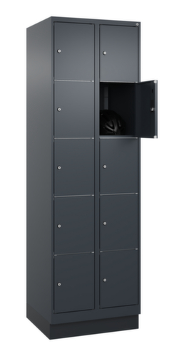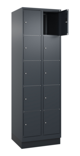 Die wichtigsten Maße des C+P Schließfachschrankes Classic Plus auf einen Blick:Korpus mit einfacher Flügeltür. Die innenliegenden Drehbolzen der einschlagenden Türen bieten den Vorteil einer sauberen Optik, da keine Schrauben oder Scharniere von außen sichtbar sind. Dadurch wird das Design des Schrankes nicht beeinträchtigt und das gesamte Möbelstück wirkt hochwertiger. Damit ist auch die glatte Oberfläche leichter zu reinigen, da keine Schmutz- oder Staubablagerungen an unzugänglichen Stellen zu befürchten sind. Jede Tür ist serienmäßig mit einer Anschlagsdämpfung ausgestattet, so dass, auch durch ein schwungvolles Schließen, die Tür nicht zuknallt. Das trägt nicht nur zu einer angenehmeren Geräuschkulisse bei, sondern schont auch den Stahlschrank vor Beschädigungen. Von der Natur inspiriert schafft der BIONIC Steel Frame eine besonders effiziente und stabile Konstruktion. Durch eine raffinierte innere Struktur aus Faltungen, Streben und Zwischenräumen, sowie höhere Materialstärke an entscheidenden Stellen, wie z. B. im vorderen Bereich der Seitenwände und in den Trennwand- und Kastenprofilen, wird die Verwindungssteifigkeit zusätzlich erhöht. Verschließbar mit Zylinderschloss. Der untergebaute Sockel sorgt dafür, dass das Gewicht des Schrankes gleichmäßig auf dem Boden verteilt wird. Dies erhöht die Stabilität und der Schrank kann schwerer Lasten aufnehmen, als ein Schrank mit Füßen. Außerdem können Schmutz, Staub und Feuchtigkeit nicht unter den Schrank gelangen, was die Reinigungsfläche verkleinert. Konstruktion aus Stahl, stabil verschweißt. Das macht die Konstruktion besonders robust und widerstandsfähig und somit langlebiger. Die verschweißten Ecken und Kanten des Korpus gewährleisten eine höhere Dichtigkeit und somit eine bessere Schutzfunktion gegen Staub, Feuchtigkeit und Schmutz als eine geschraubte Konstruktion. Zudem sind keine regelmäßigen Wartungsarbeiten und Nachjustierungen nötig. Korpus mit Einbrennlackierung in RAL7016 Anthrazitgrau. Front mit Einbrennlackierung in RAL7016 Anthrazitgrau.