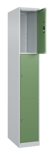 Die wichtigsten Maße des C+P Schließfachschrankes Classic Plus auf einen Blick:Korpus mit einfacher Flügeltür. Die innenliegenden Drehbolzen der einschlagenden Türen bieten den Vorteil einer sauberen Optik, da keine Schrauben oder Scharniere von außen sichtbar sind. Dadurch wird das Design des Schrankes nicht beeinträchtigt und das gesamte Möbelstück wirkt hochwertiger. Damit ist auch die glatte Oberfläche leichter zu reinigen, da keine Schmutz- oder Staubablagerungen an unzugänglichen Stellen zu befürchten sind. Jede Tür ist serienmäßig mit einer Anschlagsdämpfung ausgestattet, so dass, auch durch ein schwungvolles Schließen, die Tür nicht zuknallt. Das trägt nicht nur zu einer angenehmeren Geräuschkulisse bei, sondern schont auch den Stahlschrank vor Beschädigungen. Von der Natur inspiriert schafft der BIONIC Steel Frame eine besonders effiziente und stabile Konstruktion. Durch eine raffinierte innere Struktur aus Faltungen, Streben und Zwischenräumen, sowie höhere Materialstärke an entscheidenden Stellen, wie z. B. im vorderen Bereich der Seitenwände und in den Trennwand- und Kastenprofilen, wird die Verwindungssteifigkeit zusätzlich erhöht. Verschließbar mit Zylinderschloss. Für eine besonders schlanke und raumsparende Optik steht der Schrank ohne Sockel oder Füße direkt auf dem Boden. Lediglich Bodenausgleichsschrauben sorgen für einen wackelfreien Stand bei eventuellen Bodenunebenheiten. Der Schrankboden ist für einen erhöhten Korrosionsschutz zusätzlich verzinkt. Konstruktion aus Stahl, stabil verschweißt. Das macht die Konstruktion besonders robust und widerstandsfähig und somit langlebiger. Die verschweißten Ecken und Kanten des Korpus gewährleisten eine höhere Dichtigkeit und somit eine bessere Schutzfunktion gegen Staub, Feuchtigkeit und Schmutz als eine geschraubte Konstruktion. Zudem sind keine regelmäßigen Wartungsarbeiten und Nachjustierungen nötig. Korpus mit Einbrennlackierung in RAL7035 Lichtgrau. Front mit Einbrennlackierung in RAL6011 Resedagrün.