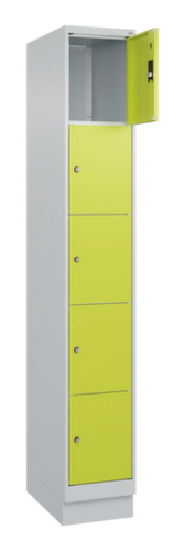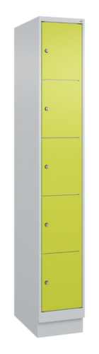 Die wichtigsten Maße des C+P Schließfachschrankes Classic Plus auf einen Blick:Korpus mit einfacher Flügeltür. Die innenliegenden Drehbolzen der einschlagenden Türen bieten den Vorteil einer sauberen Optik, da keine Schrauben oder Scharniere von außen sichtbar sind. Dadurch wird das Design des Schrankes nicht beeinträchtigt und das gesamte Möbelstück wirkt hochwertiger. Damit ist auch die glatte Oberfläche leichter zu reinigen, da keine Schmutz- oder Staubablagerungen an unzugänglichen Stellen zu befürchten sind. Jede Tür ist serienmäßig mit einer Anschlagsdämpfung ausgestattet, so dass, auch durch ein schwungvolles Schließen, die Tür nicht zuknallt. Das trägt nicht nur zu einer angenehmeren Geräuschkulisse bei, sondern schont auch den Stahlschrank vor Beschädigungen. Von der Natur inspiriert schafft der BIONIC Steel Frame eine besonders effiziente und stabile Konstruktion. Durch eine raffinierte innere Struktur aus Faltungen, Streben und Zwischenräumen, sowie höhere Materialstärke an entscheidenden Stellen, wie z. B. im vorderen Bereich der Seitenwände und in den Trennwand- und Kastenprofilen, wird die Verwindungssteifigkeit zusätzlich erhöht. Verschließbar mit Zylinderschloss. Der untergebaute Sockel sorgt dafür, dass das Gewicht des Schrankes gleichmäßig auf dem Boden verteilt wird. Dies erhöht die Stabilität und der Schrank kann schwerer Lasten aufnehmen, als ein Schrank mit Füßen. Außerdem können Schmutz, Staub und Feuchtigkeit nicht unter den Schrank gelangen, was die Reinigungsfläche verkleinert. Konstruktion aus Stahl, stabil verschweißt. Das macht die Konstruktion besonders robust und widerstandsfähig und somit langlebiger. Die verschweißten Ecken und Kanten des Korpus gewährleisten eine höhere Dichtigkeit und somit eine bessere Schutzfunktion gegen Staub, Feuchtigkeit und Schmutz als eine geschraubte Konstruktion. Zudem sind keine regelmäßigen Wartungsarbeiten und Nachjustierungen nötig. Korpus mit Einbrennlackierung in RAL7035 Lichtgrau. Front mit Einbrennlackierung in RDS 110 80 60 Viridingrün.