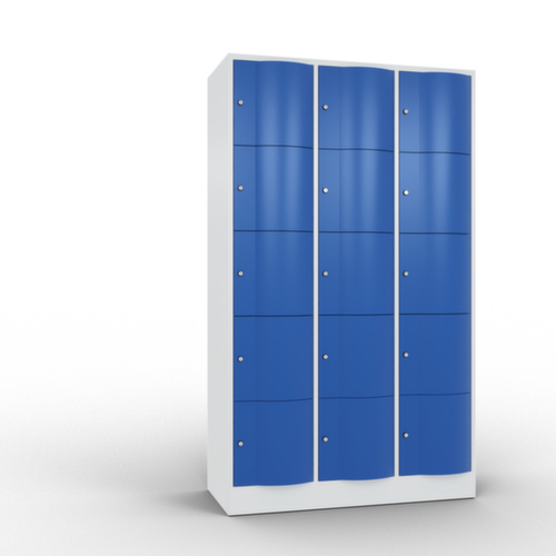 Die nach vorne gewölbte Flügeltür ist absolut stabil und vandalismussicher, sogar gegen Fußtritte. Die einschlagenden Türen sind in robusten, innenliegenden Drehstangenscharnieren aufgehängt und halte damit auch hohen Beanspruchungen stand. Jede Tür ist serienmäßig mit einer Anschlagsdämpfung ausgestattet, so dass, auch durch ein schwungvolles Schließen, die Tür nicht zuknallt. Das trägt nicht nur zu einer angenehmeren Geräuschkulisse bei, sondern schont auch den Stahlschrank vor Beschädigungen. Zudem schützt die Türöffnungsbegrenzung vor einer Überdehnung der Tür und vor der Überschneidung der Nutzfläche mit dem Nachbarschrank. Verschließbar mit Zylinderschloss. Die Lüftungsöffnungen in der Rückwand stellen eine gute Luftzirkulation in jedem Schrankfach sicher. Durch die Abdeckplatte kann der Beistellschrank als zusätzliche Arbeits- oder Ablagefläche genutzt werden. Der untergebaute Sockel sorgt dafür, dass das Gewicht des Schrankes gleichmäßig auf dem Boden verteilt wird. Dies erhöht die Stabilität und der Schrank kann schwerer Lasten aufnehmen, als ein Schrank mit Füßen. Außerdem können Schmutz, Staub und Feuchtigkeit nicht unter den Schrank gelangen, was die Reinigungsfläche verkleinert. Konstruktion aus Stahlblech, verschweißt. Korpus mit Einbrennlackierung. Front mit Einbrennlackierung.