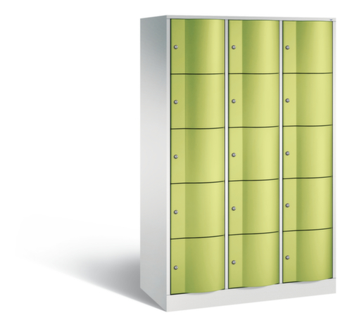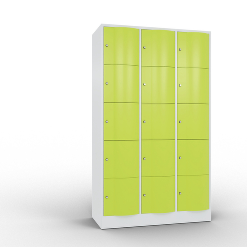 Die nach vorne gewölbte Flügeltür ist absolut stabil und vandalismussicher, sogar gegen Fußtritte. Die einschlagenden Türen sind in robusten, innenliegenden Drehstangenscharnieren aufgehängt und halte damit auch hohen Beanspruchungen stand. Jede Tür ist serienmäßig mit einer Anschlagsdämpfung ausgestattet, so dass, auch durch ein schwungvolles Schließen, die Tür nicht zuknallt. Das trägt nicht nur zu einer angenehmeren Geräuschkulisse bei, sondern schont auch den Stahlschrank vor Beschädigungen. Zudem schützt die Türöffnungsbegrenzung vor einer Überdehnung der Tür und vor der Überschneidung der Nutzfläche mit dem Nachbarschrank. Verschließbar mit Zylinderschloss. Die Lüftungsöffnungen in der Rückwand stellen eine gute Luftzirkulation in jedem Schrankfach sicher. Durch die Abdeckplatte kann der Beistellschrank als zusätzliche Arbeits- oder Ablagefläche genutzt werden. Der untergebaute Sockel sorgt dafür, dass das Gewicht des Schrankes gleichmäßig auf dem Boden verteilt wird. Dies erhöht die Stabilität und der Schrank kann schwerer Lasten aufnehmen, als ein Schrank mit Füßen. Außerdem können Schmutz, Staub und Feuchtigkeit nicht unter den Schrank gelangen, was die Reinigungsfläche verkleinert. Konstruktion aus Stahlblech, verschweißt. Korpus mit Einbrennlackierung. Front mit Einbrennlackierung.