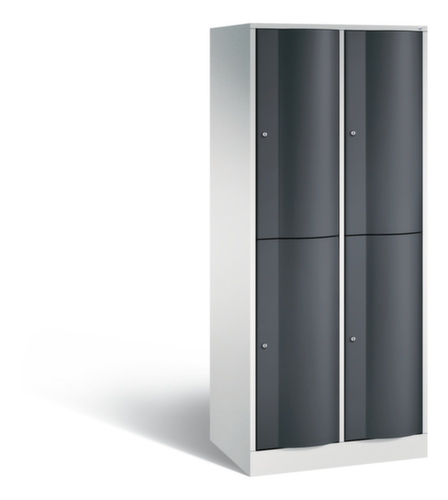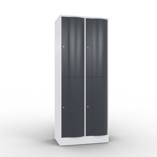 Die nach vorne gewölbte Flügeltür ist absolut stabil und vandalismussicher, sogar gegen Fußtritte. Die einschlagenden Türen sind in robusten, innenliegenden Drehstangenscharnieren aufgehängt und halte damit auch hohen Beanspruchungen stand. Jede Tür ist serienmäßig mit einer Anschlagsdämpfung ausgestattet, so dass, auch durch ein schwungvolles Schließen, die Tür nicht zuknallt. Das trägt nicht nur zu einer angenehmeren Geräuschkulisse bei, sondern schont auch den Stahlschrank vor Beschädigungen. Zudem schützt die Türöffnungsbegrenzung vor einer Überdehnung der Tür und vor der Überschneidung der Nutzfläche mit dem Nachbarschrank. Verschließbar mit Zylinderschloss. Die Lüftungsöffnungen in der Rückwand stellen eine gute Luftzirkulation in jedem Schrankfach sicher. Durch die Abdeckplatte kann der Beistellschrank als zusätzliche Arbeits- oder Ablagefläche genutzt werden. Der untergebaute Sockel sorgt dafür, dass das Gewicht des Schrankes gleichmäßig auf dem Boden verteilt wird. Dies erhöht die Stabilität und der Schrank kann schwerer Lasten aufnehmen, als ein Schrank mit Füßen. Außerdem können Schmutz, Staub und Feuchtigkeit nicht unter den Schrank gelangen, was die Reinigungsfläche verkleinert. Konstruktion aus Stahlblech, verschweißt. Korpus mit Einbrennlackierung. Front mit Einbrennlackierung.