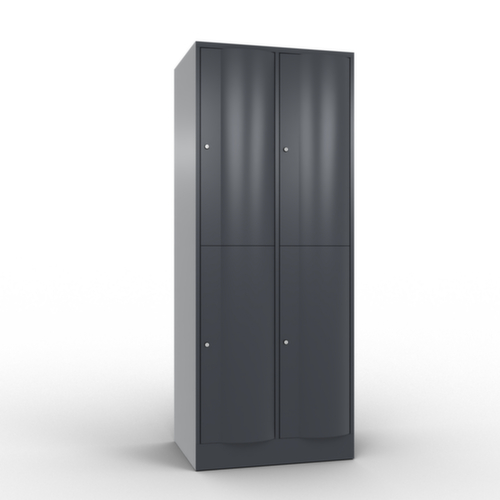 Die nach vorne gewölbte Flügeltür ist absolut stabil und vandalismussicher, sogar gegen Fußtritte. Die einschlagenden Türen sind in robusten, innenliegenden Drehstangenscharnieren aufgehängt und halte damit auch hohen Beanspruchungen stand. Jede Tür ist serienmäßig mit einer Anschlagsdämpfung ausgestattet, so dass, auch durch ein schwungvolles Schließen, die Tür nicht zuknallt. Das trägt nicht nur zu einer angenehmeren Geräuschkulisse bei, sondern schont auch den Stahlschrank vor Beschädigungen. Zudem schützt die Türöffnungsbegrenzung vor einer Überdehnung der Tür und vor der Überschneidung der Nutzfläche mit dem Nachbarschrank. Verschließbar mit Zylinderschloss. Die Lüftungsöffnungen in der Rückwand stellen eine gute Luftzirkulation in jedem Schrankfach sicher. Durch die Abdeckplatte kann der Beistellschrank als zusätzliche Arbeits- oder Ablagefläche genutzt werden. Der untergebaute Sockel sorgt dafür, dass das Gewicht des Schrankes gleichmäßig auf dem Boden verteilt wird. Dies erhöht die Stabilität und der Schrank kann schwerer Lasten aufnehmen, als ein Schrank mit Füßen. Außerdem können Schmutz, Staub und Feuchtigkeit nicht unter den Schrank gelangen, was die Reinigungsfläche verkleinert. Konstruktion aus Stahlblech, verschweißt. Korpus mit Einbrennlackierung. Front mit Einbrennlackierung.